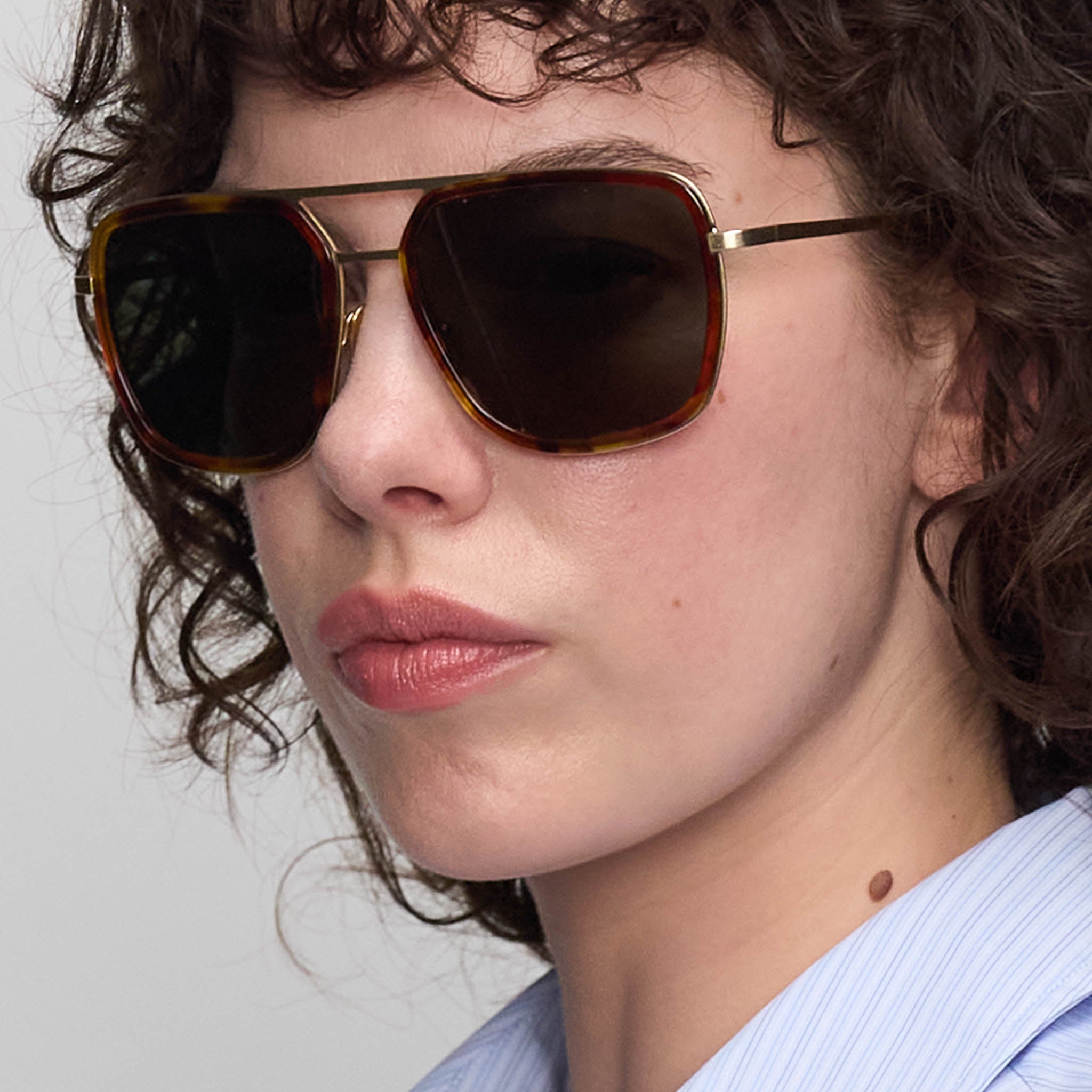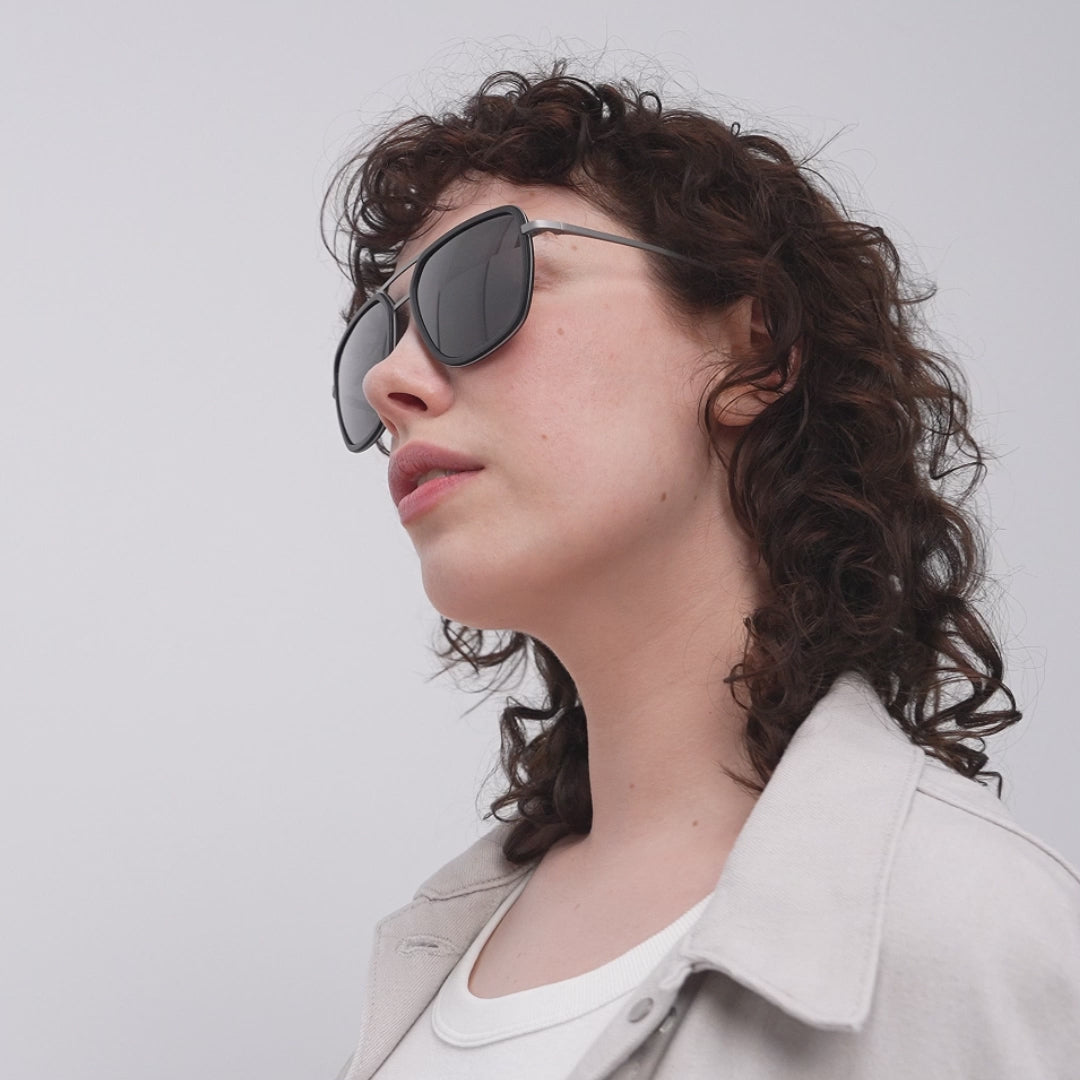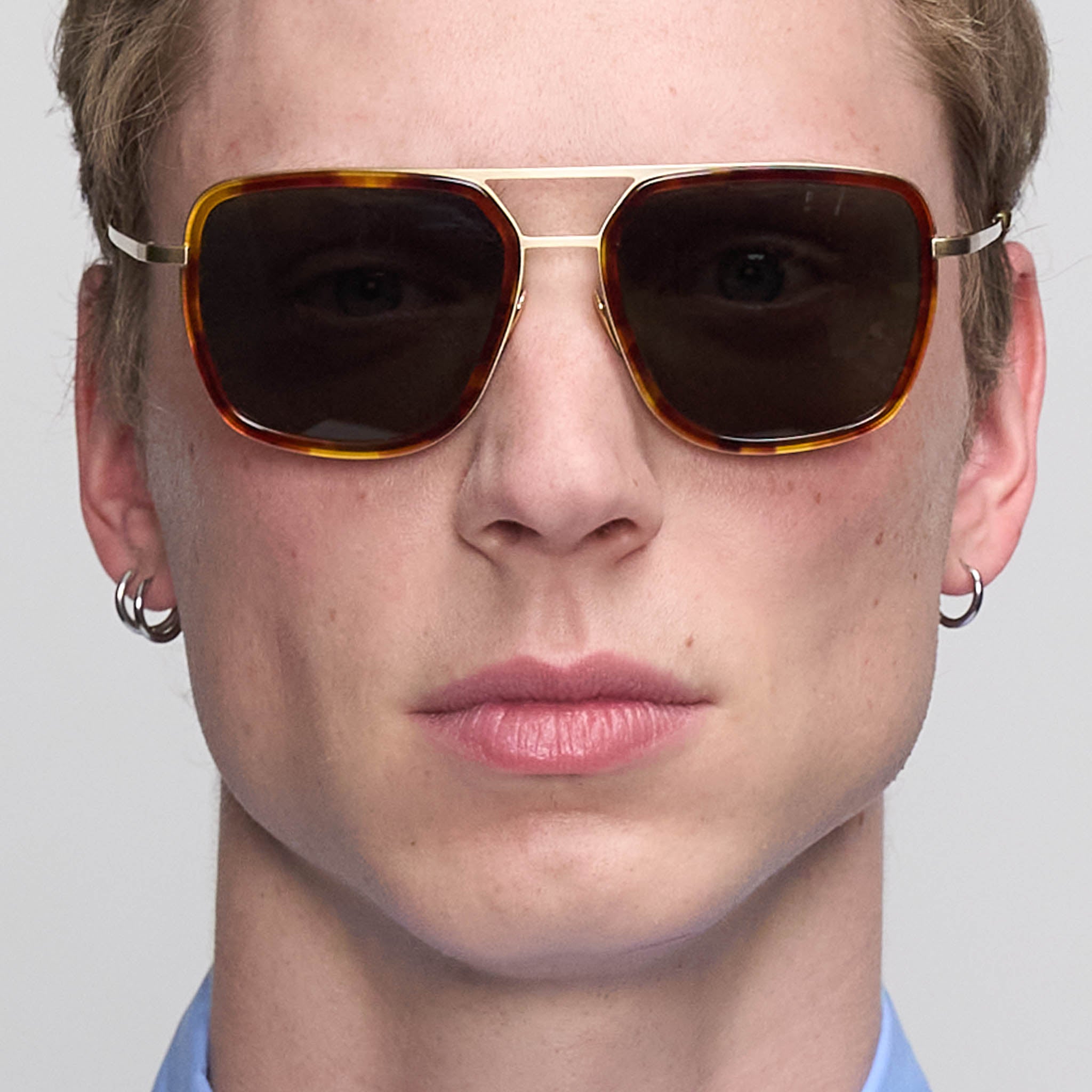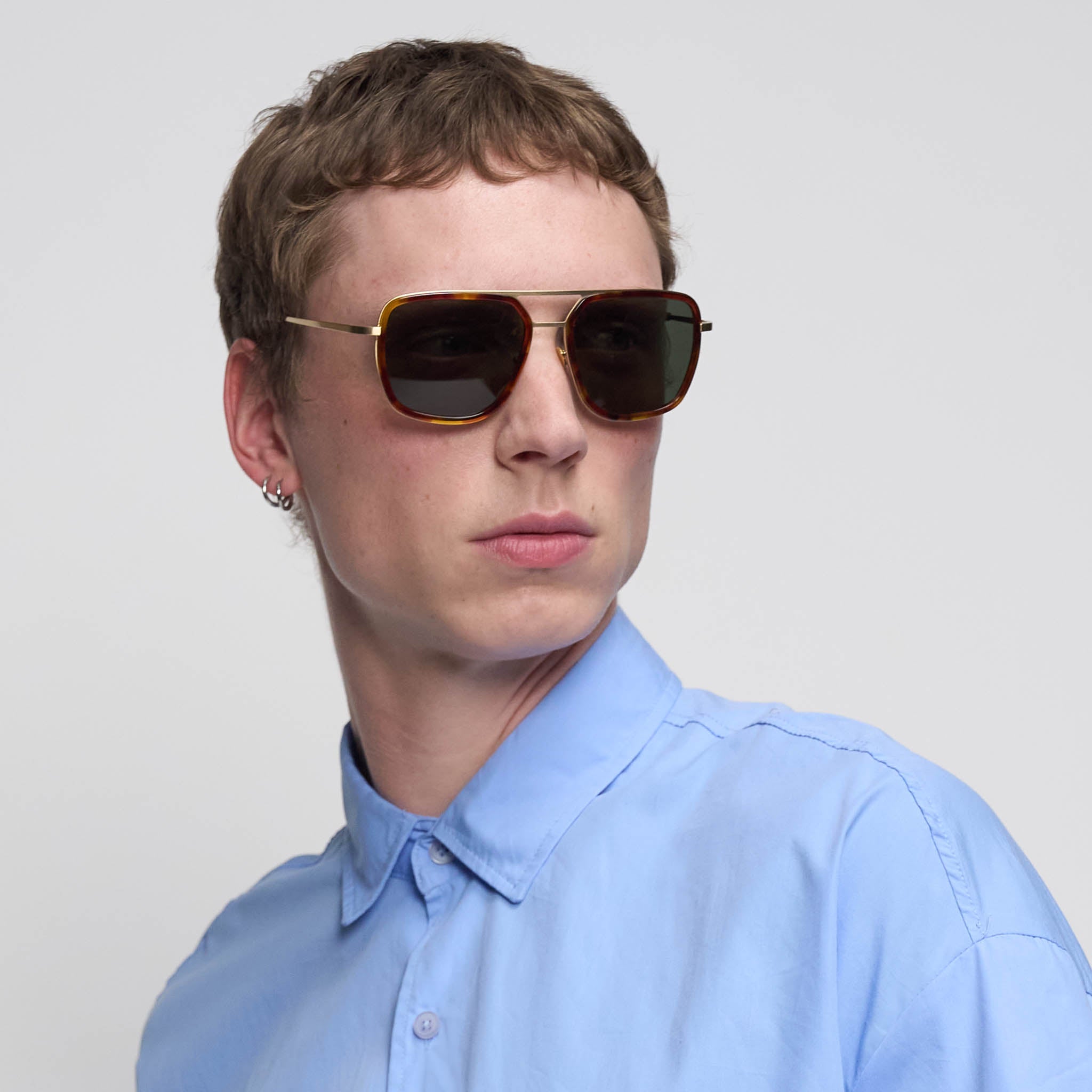 - Aviator – Upscaled: Wide fit, flat form and grey-green lenses, set in brushed golden stainless steel and Havana brown bio-acetate – With its mix of materials and its large proportions, the Aero Funk is a modern take on a classic design.