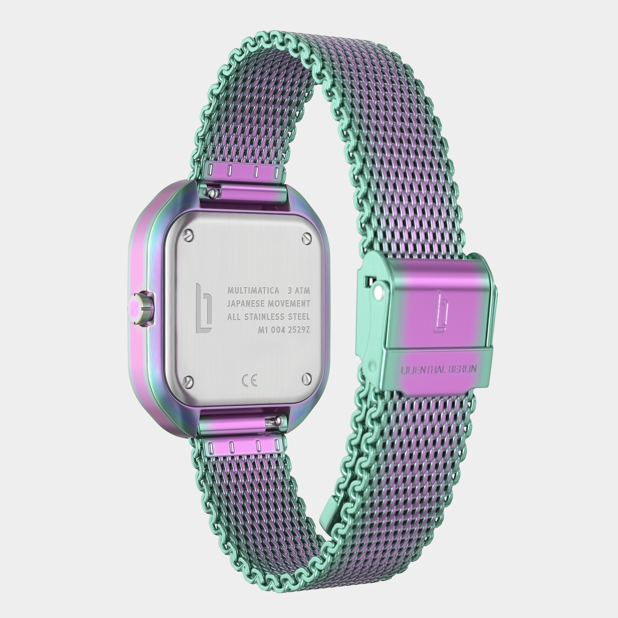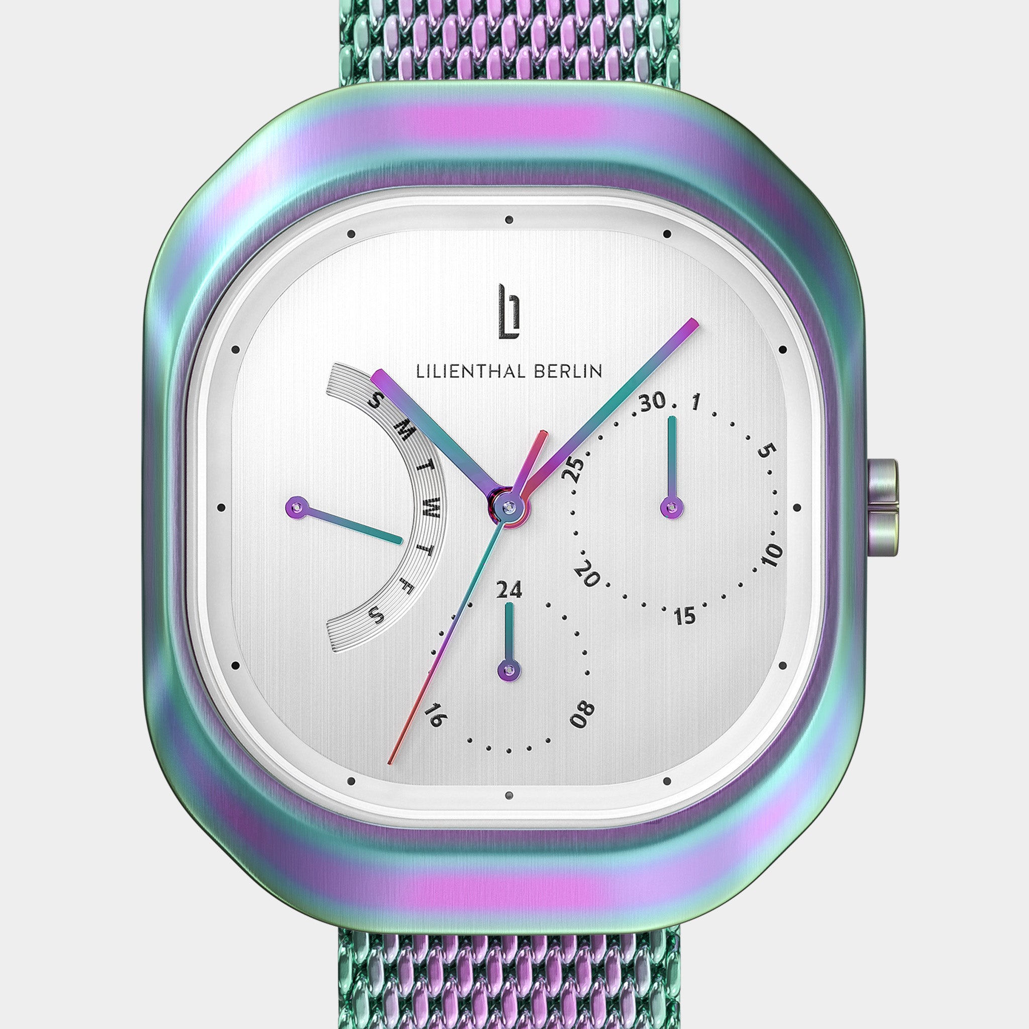 - Radiant Finish: Both the case and dial feature a unique color-shifting effect. With delicate hands, small Superluminova elements, and displays for date and weekday, the design offers subtle complexity while remaining effortlessly readable.