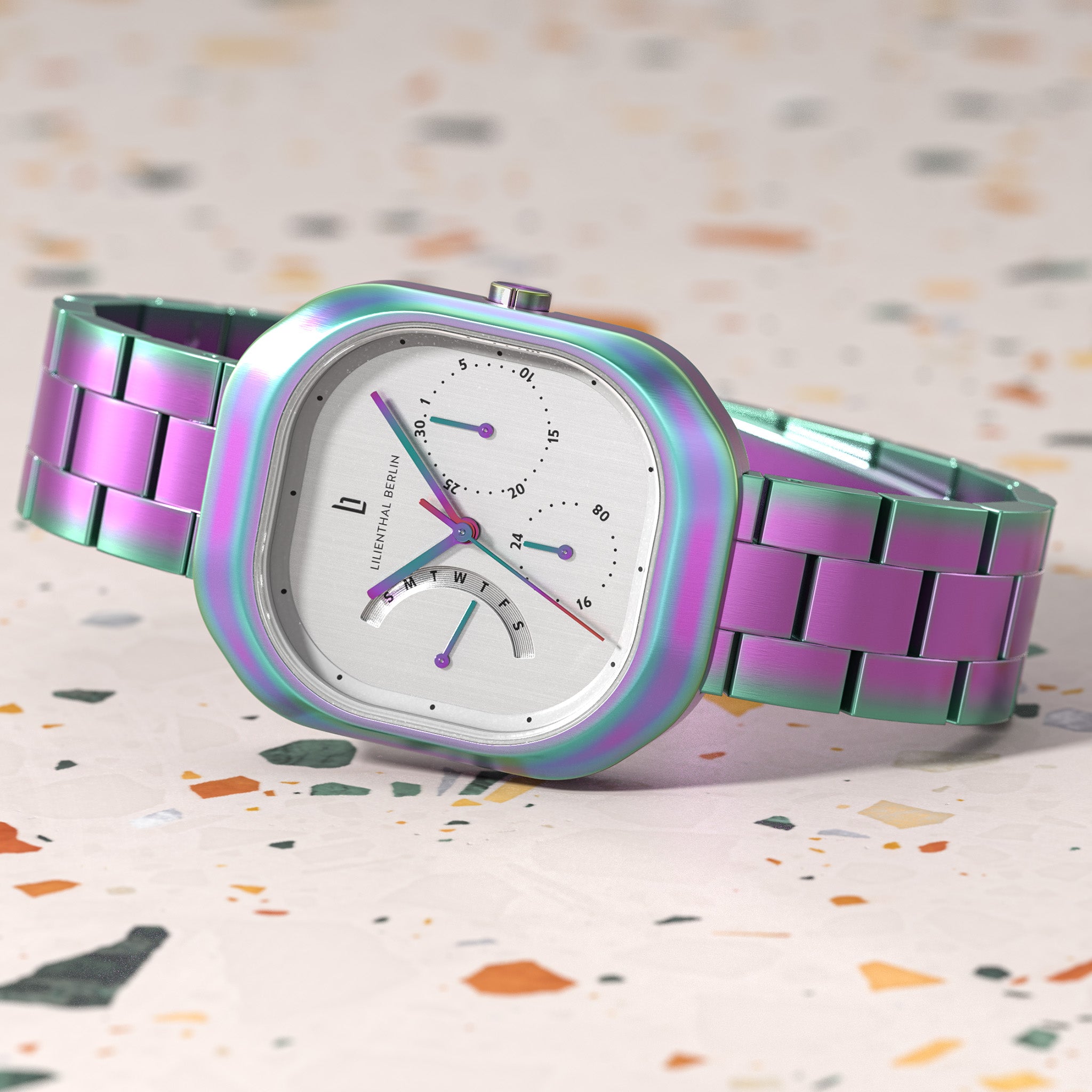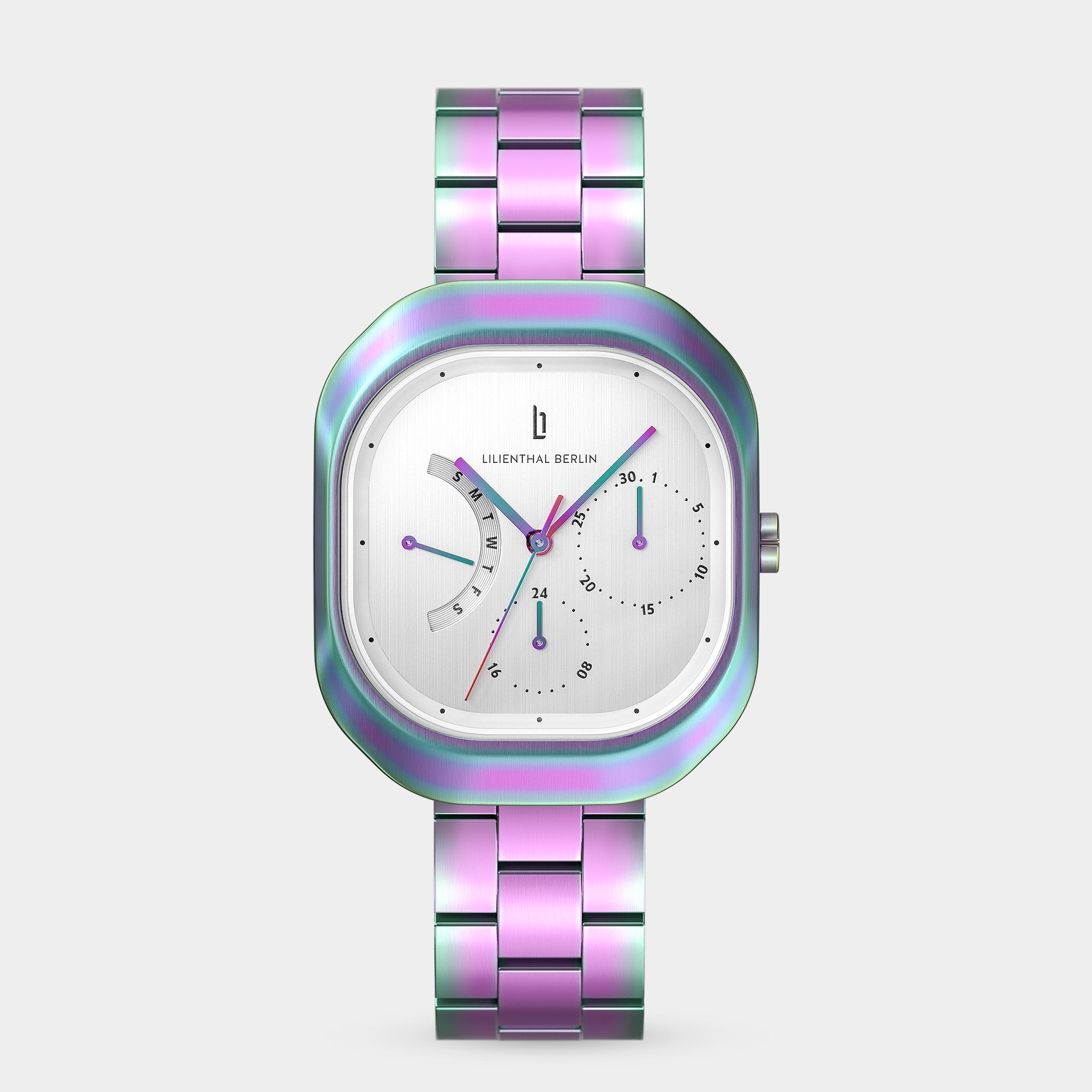 • Radiant Finish: Both the case and dial feature a unique color-shifting effect. With delicate hands, small Superluminova elements, and displays for date and weekday, the design offers subtle complexity while remaining effortlessly readable.