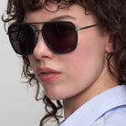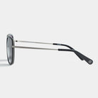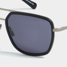 - Aviator w nowoczesnej odsłonie: Szeroka oprawa, płaski design i szare soczewki – oprawione w matową czarną stal nierdzewną i bioacetat.