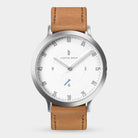 • Ikoniczny design: Biała, lakierowana tarcza, koperta 42,5 mm w kolorze srebrnym z wbudowaną koroną i wymiennym paskiem skórzanym – tutaj styl spotyka funkcjonalność.