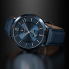 - Ponadczasowy design: Polerowana koperta i tarcza są w głębokim odcieniu niebieskiego. Różowe złote akcenty, takie jak smukłe indeksy i cyfry na pozycjach 12 i 6, dodają nowoczesnego i ponadczasowego charakteru.