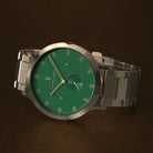 • Ikoniczny design: Matowa zielona tarcza, szczotkowana złota koperta 42,5 mm z wpuszczoną koronką i wymienny pasek — tam, gdzie styl spotyka funkcjonalność.