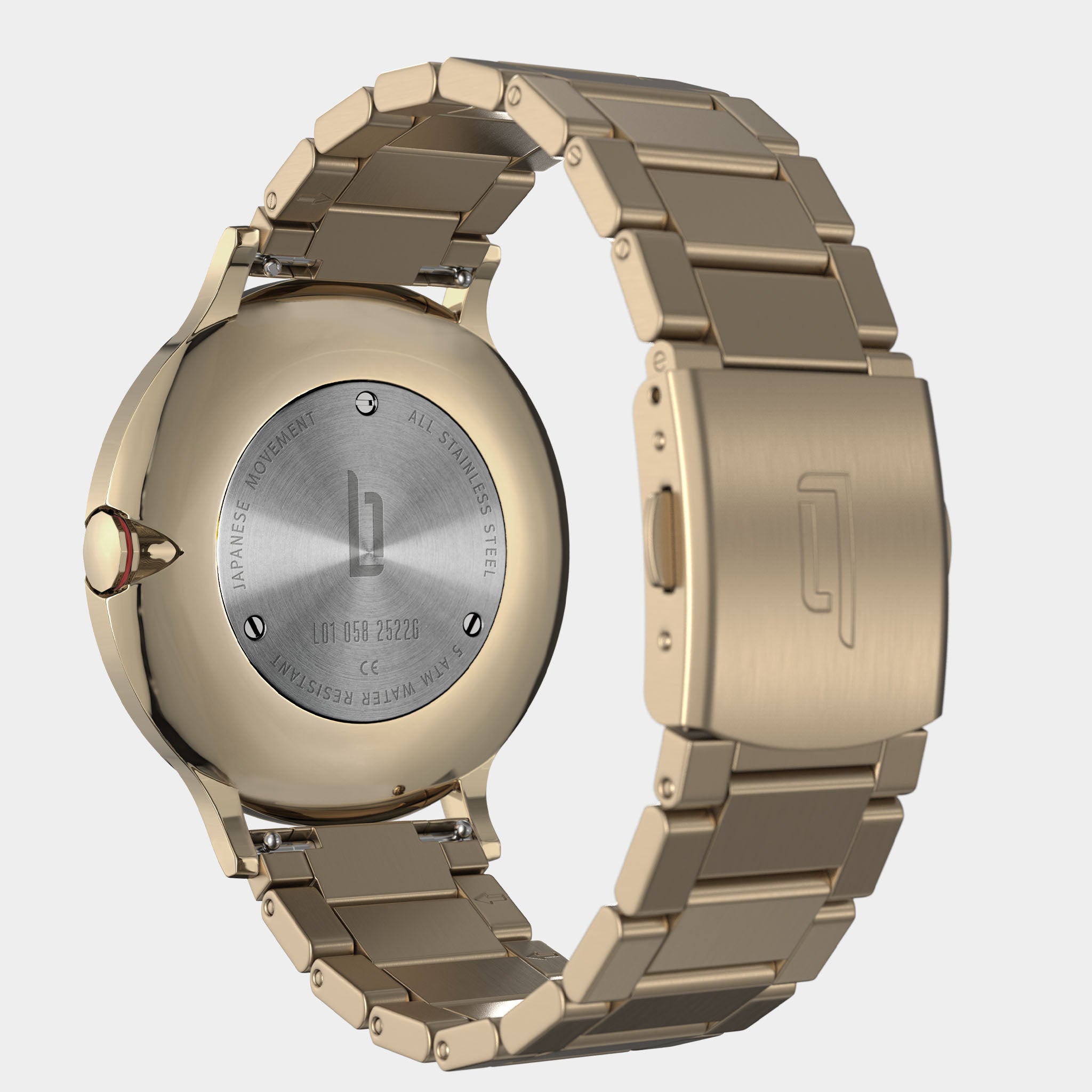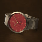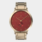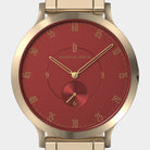 - Ikoniczny design: Matowa czerwona tarcza, szczotkowana złota koperta 42,5 mm z wpuszczoną koronką i wymienny pasek — tam, gdzie styl spotyka funkcjonalność.