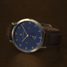 - Ikoniczny design: Matowa niebieska tarcza, szczotkowana złota koperta 42,5 mm z wpuszczoną koronką i wymienny skórzany pasek — tam, gdzie styl spotyka funkcjonalność.