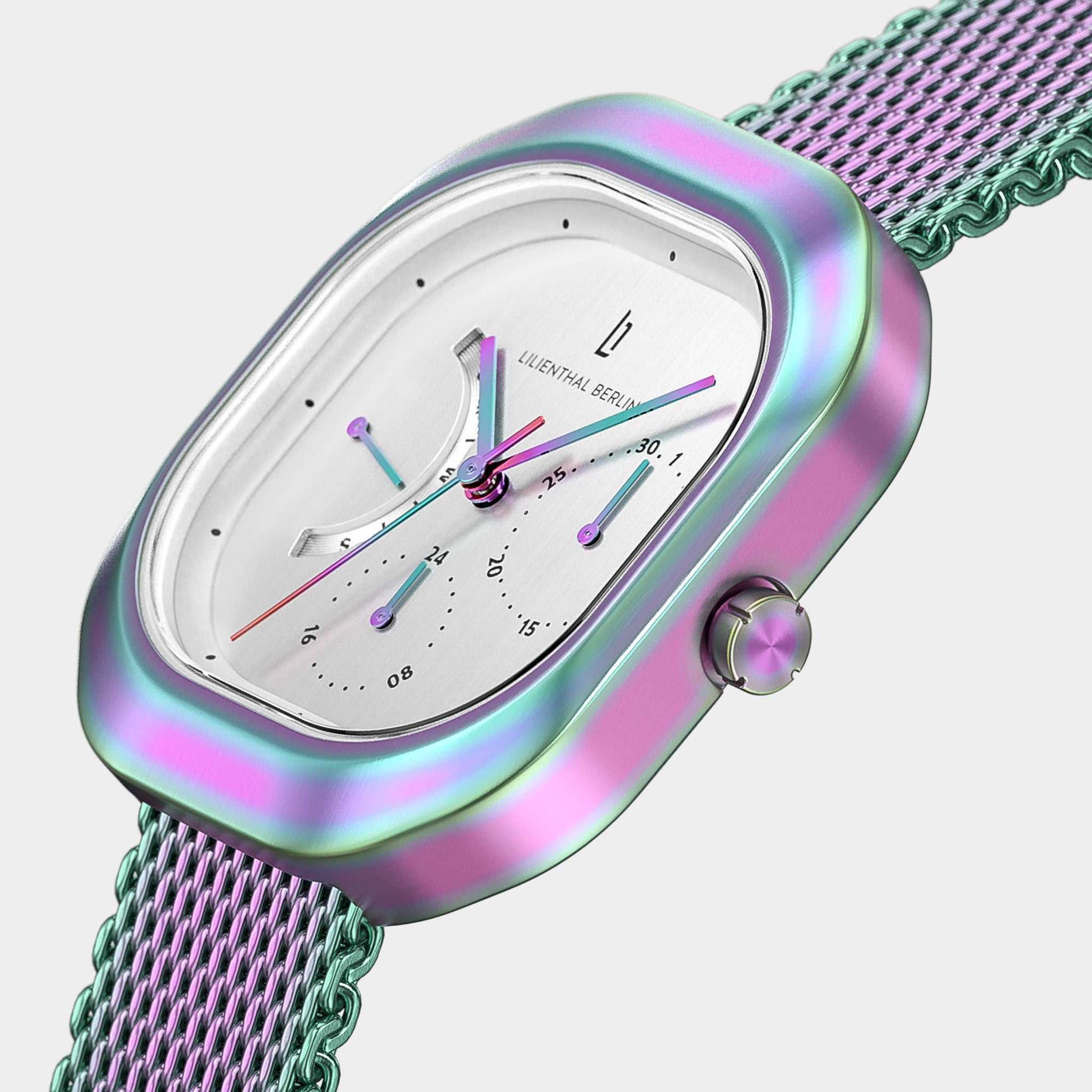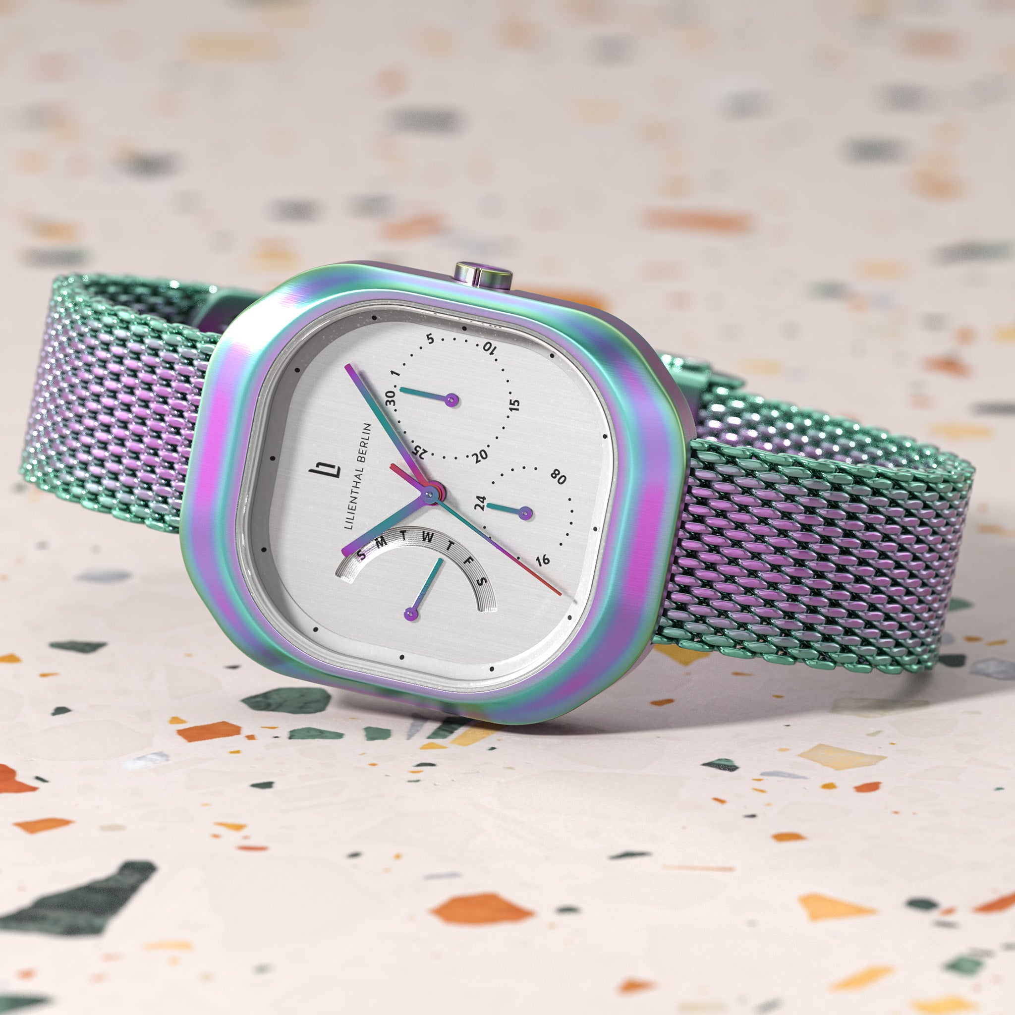 - Opalizujący efekt połysku: Wykończenie koperty i tarcza mają unikalny efekt kolorystyczny. Z delikatnymi wskazówkami, małymi elementami Superluminova oraz wyświetlaczami daty i dnia tygodnia, projekt ma pewną złożoność, ale jest łatwy do odczytania.
