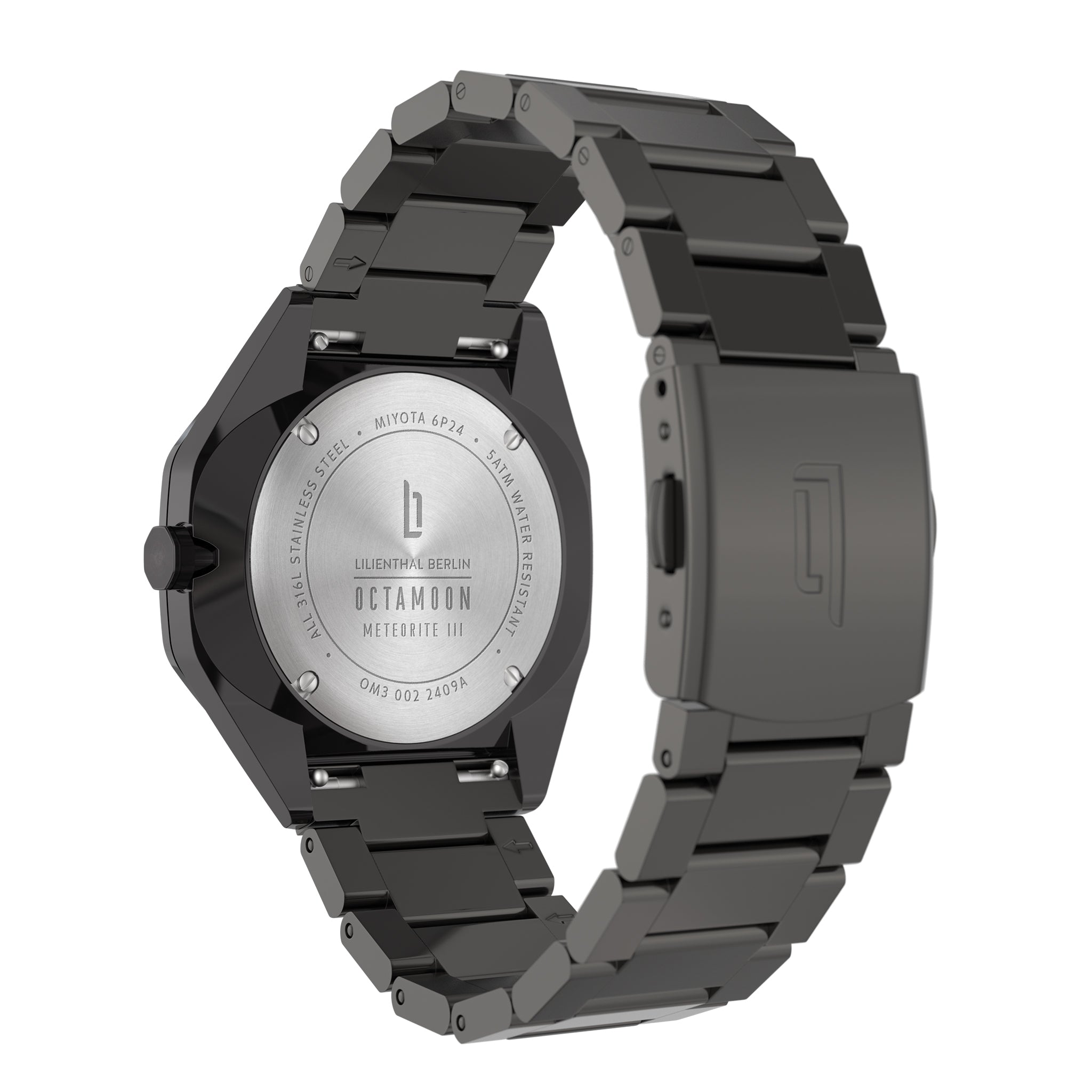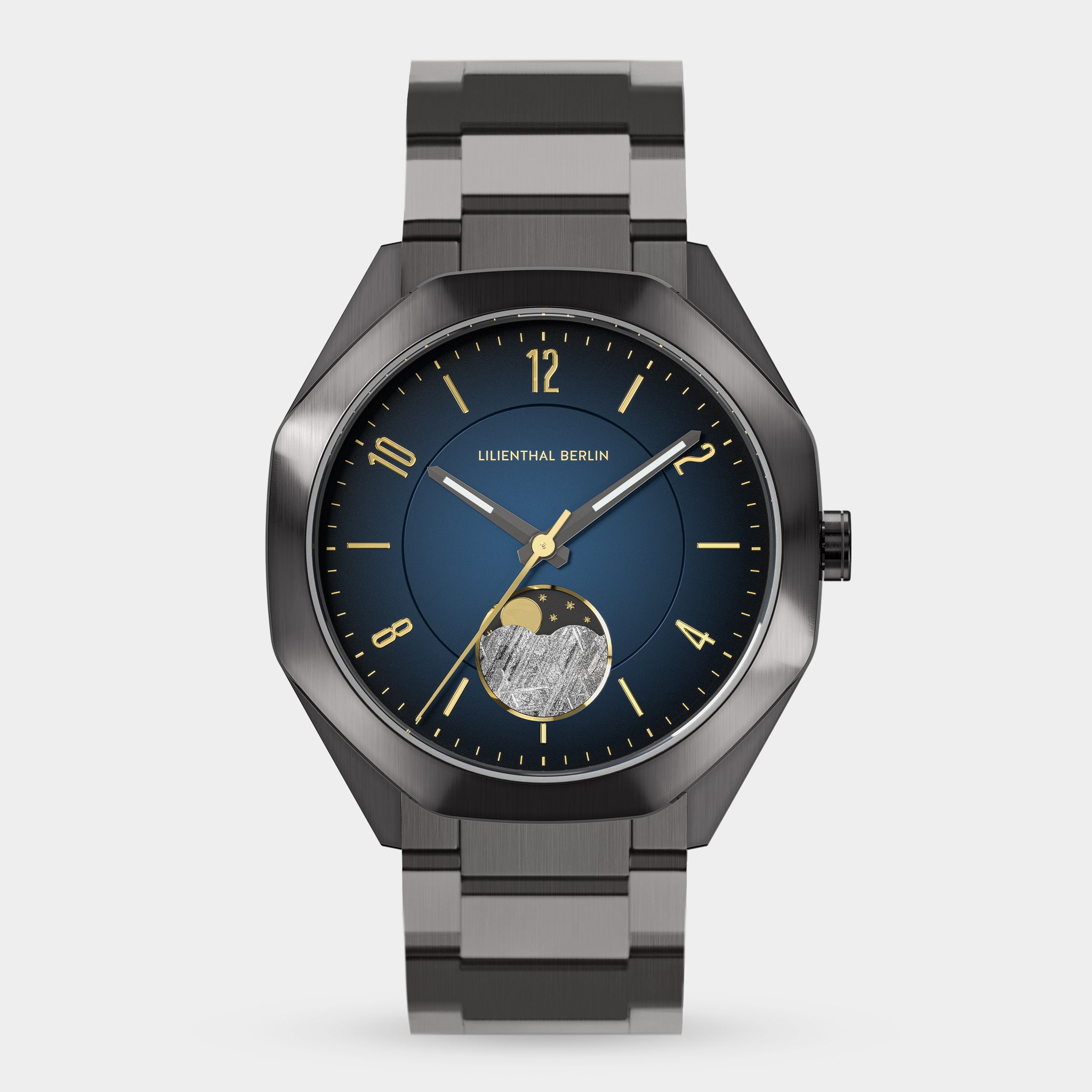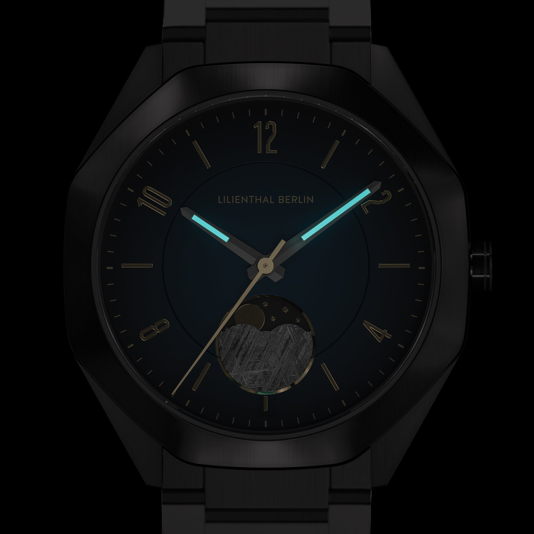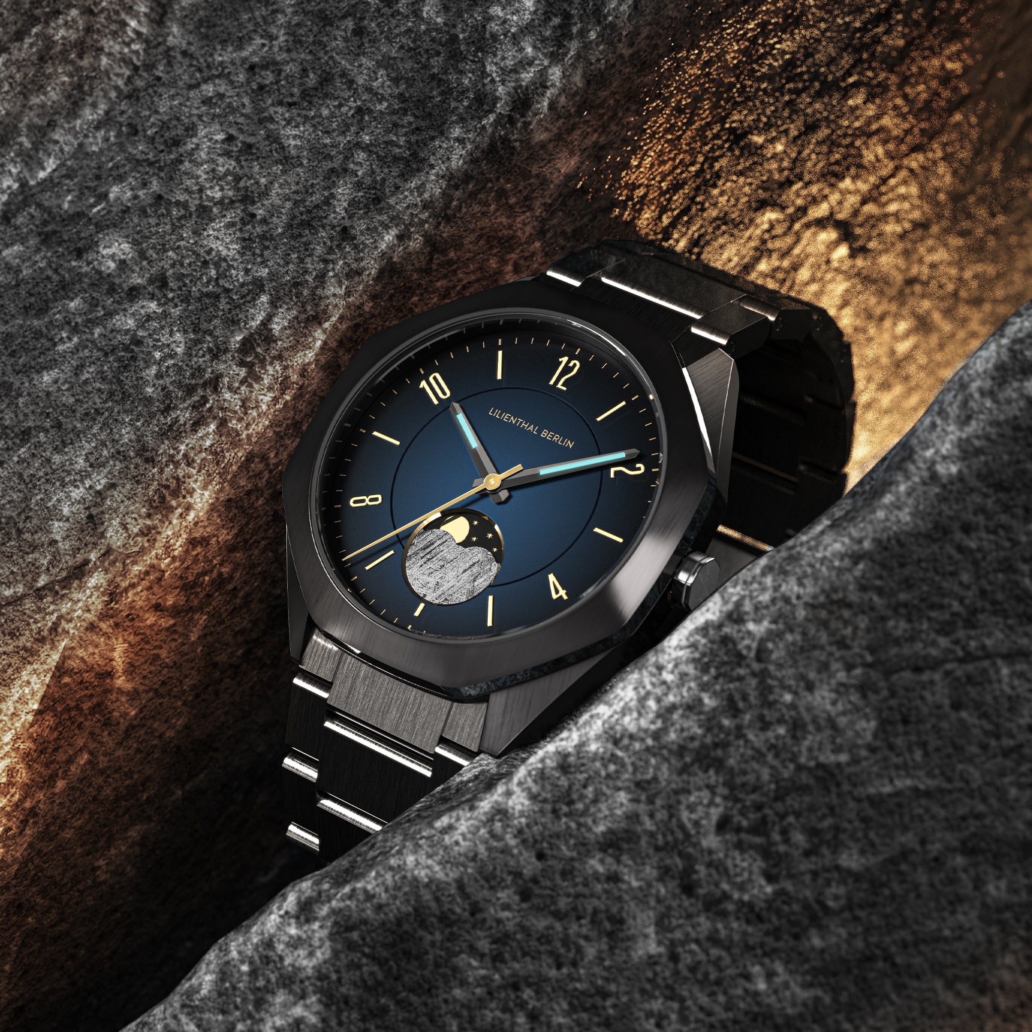 - Meteor i faza księżyca: Zegarek pokazuje również aktualną pozycję księżyca na niebie. Do wyświetlania tej funkcji wykorzystano prawdziwy kawałek meteorytu.