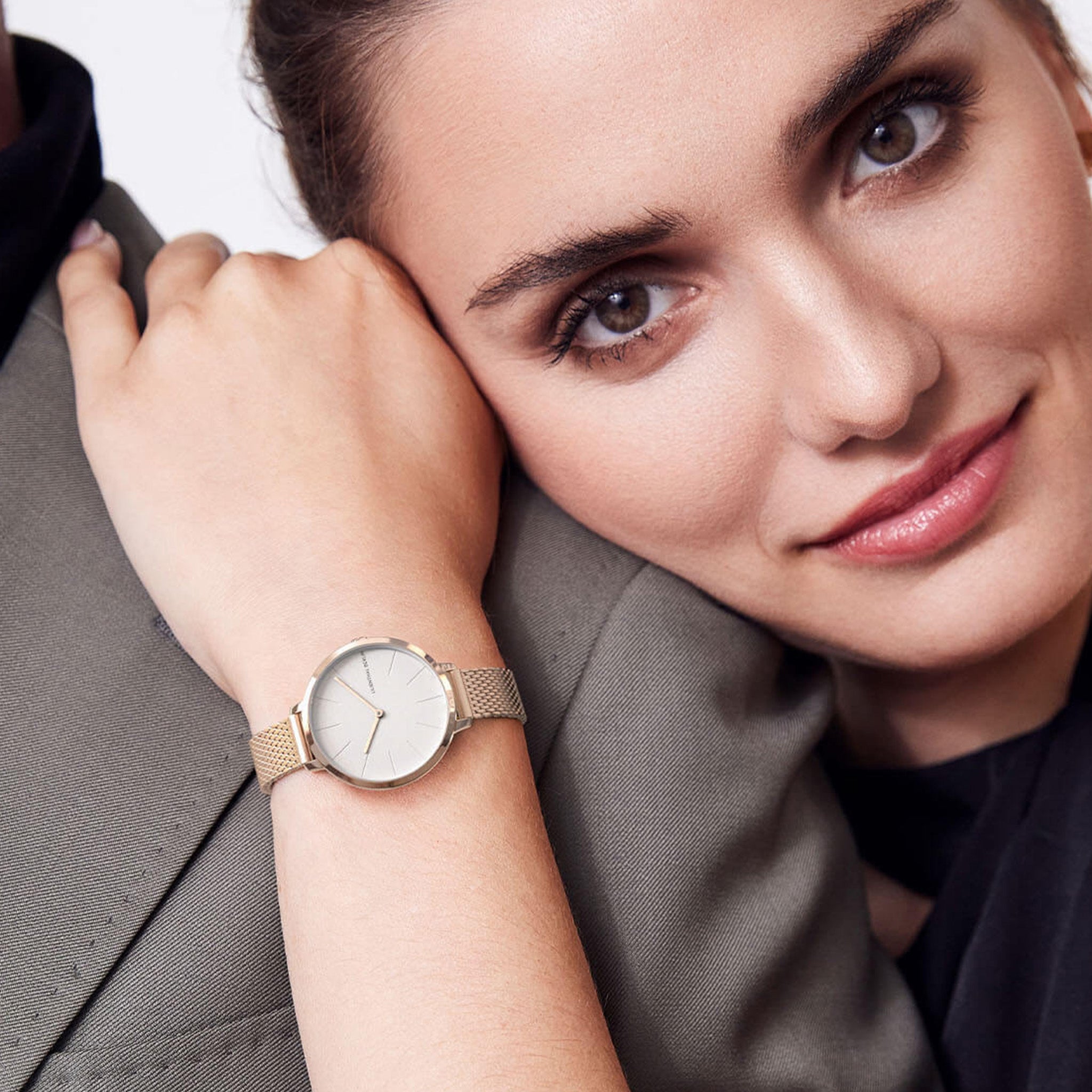 - Ponadczasowa kombinacja: 30-mm koperta w świeżym odcieniu różu, do tego tarcza w jedwabistym białym kolorze – ta kombinacja kolorów jest po prostu ikoniczna.